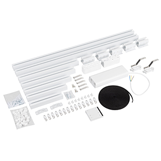1 мотор, 1 пульт дистанционного управления, алюминиевый профиль 1,6 мм (0.9м 2 шт., 0.4м 1 шт., 0.35м 1 шт, 0.3м 1 шт, 0.25м 1 шт, 0.2м 1 шт), 5 соединителей 10 см, 2 шкива, ремень 14м, 2 направляющих бегунка, 26 бегунков, 2 фиксатора, 2 кронштейна, 4 крюка, 27 саморезов с дюбелями