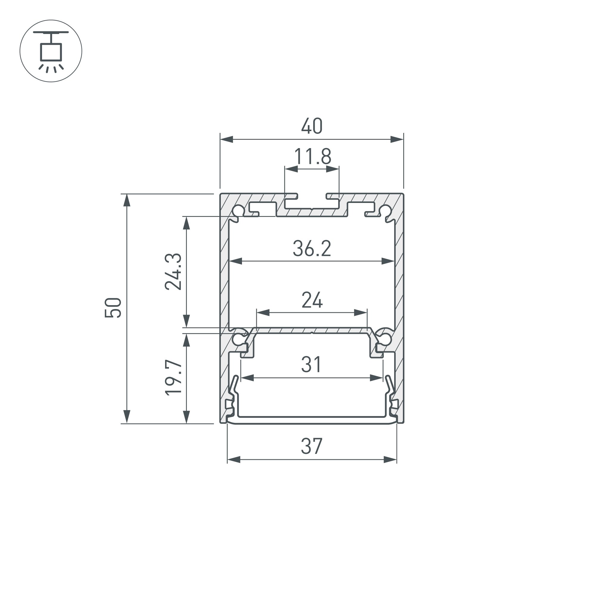 Накладной/подвесной профиль из анодированного алюминия серебристого цвета для основного освещения с возможностью герметизации до IP54 с помощью аксессуаров к профилю без дополнительного использования силиконового герметика, до IP65 с помощью аксессуаров к профилю при условии дополнительного использования силиконового герметика. Габаритные размеры профиля составляют 2000 мм в длину, 40 мм в ширину и 50 мм в высоту. Площадка для установки светодиодных лент позволяет использовать ленту шириной до 24 мм и мощностью до 36 Вт/м. Это обеспечивает гибкость в выборе светодиодных лент и позволяет создать потрясающие световые решения. Экран, заглушки и другие аксессуары не включены в комплект и приобретаются отдельно. Цена указана за 1 метр профиля. Отличное решение для создания современных световых проектов.