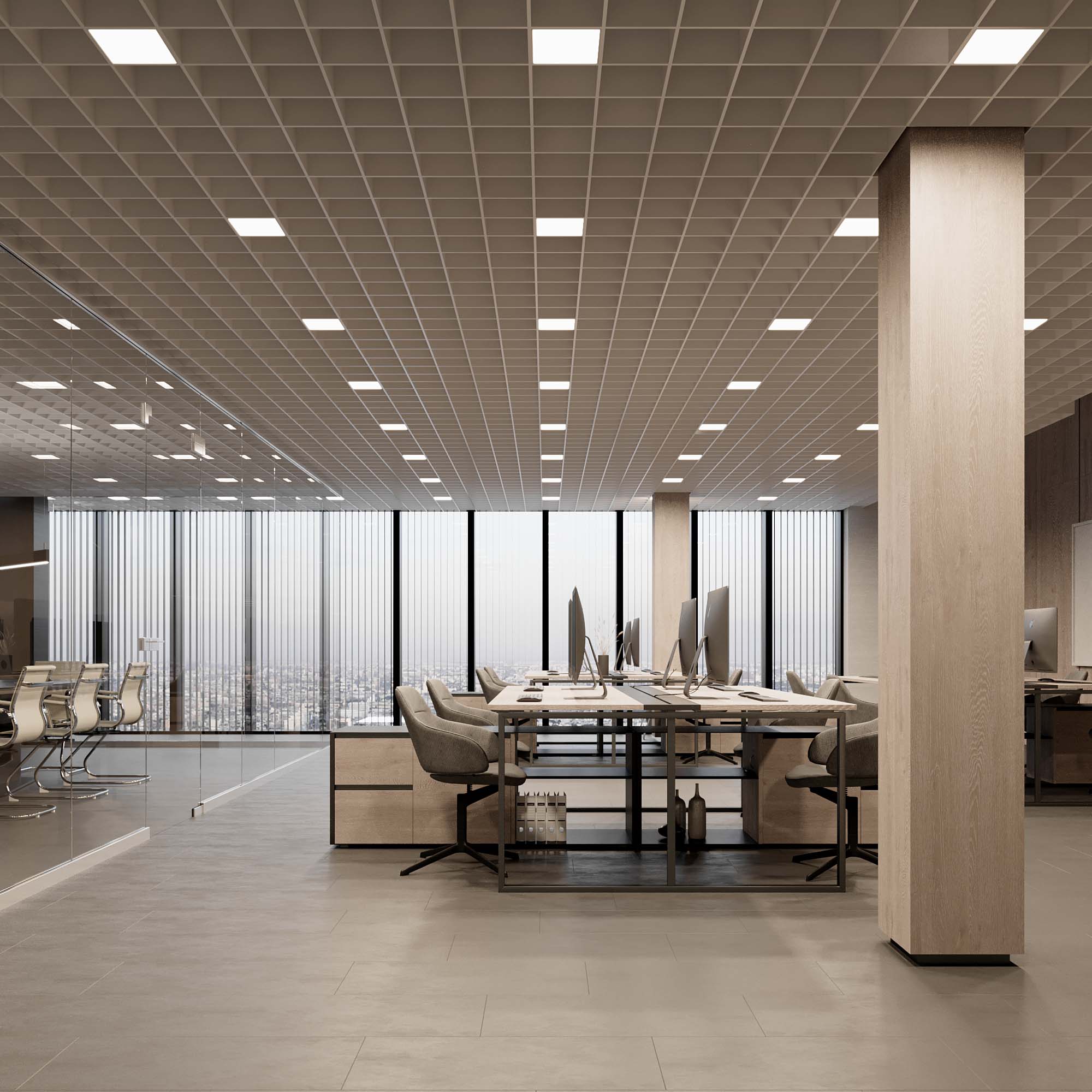 Встраиваемый светильник даунлайт для установки в потолки Грильято с размером ячейки 200х200 мм и высотой направляющих 30, 40 или 50 мм. Мощность 24 Вт, св. поток 2157 лм, 90 лм/Вт, тёплый 3000 K, CRI>90, угол 100°, напряжение питания 230 В. Серый квадратный корпус из алюминия (RAL 7045), степень защиты IP40. Размер: длина 190 мм, ширина 190 мм, высота 40 мм. Монтаж встраиваемый, установочное отверстие: длина 190 мм, ширина 190 мм. Драйвер 24-40 В, 600 мА, пульсация <1%.